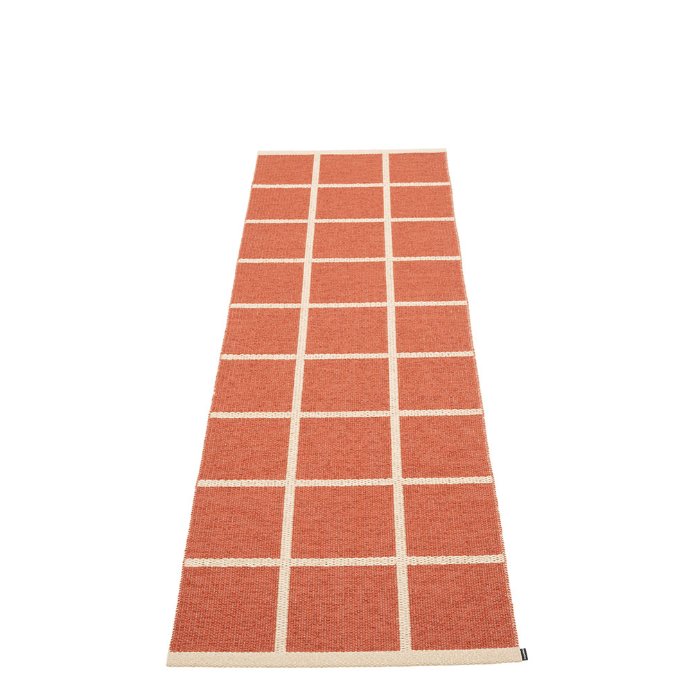 Smuk tæppeløber i giftfri plast, vævet af de bedste på markedet: Pappelina. Tæppet kan vaskes i vaskemaskine, og er meget holdbart og robust, samtidig med at det ligger helt plant på gulvet. Ikke noget med at man skrider rundt i det, som man f.eks. gør med løbere i bomuld.