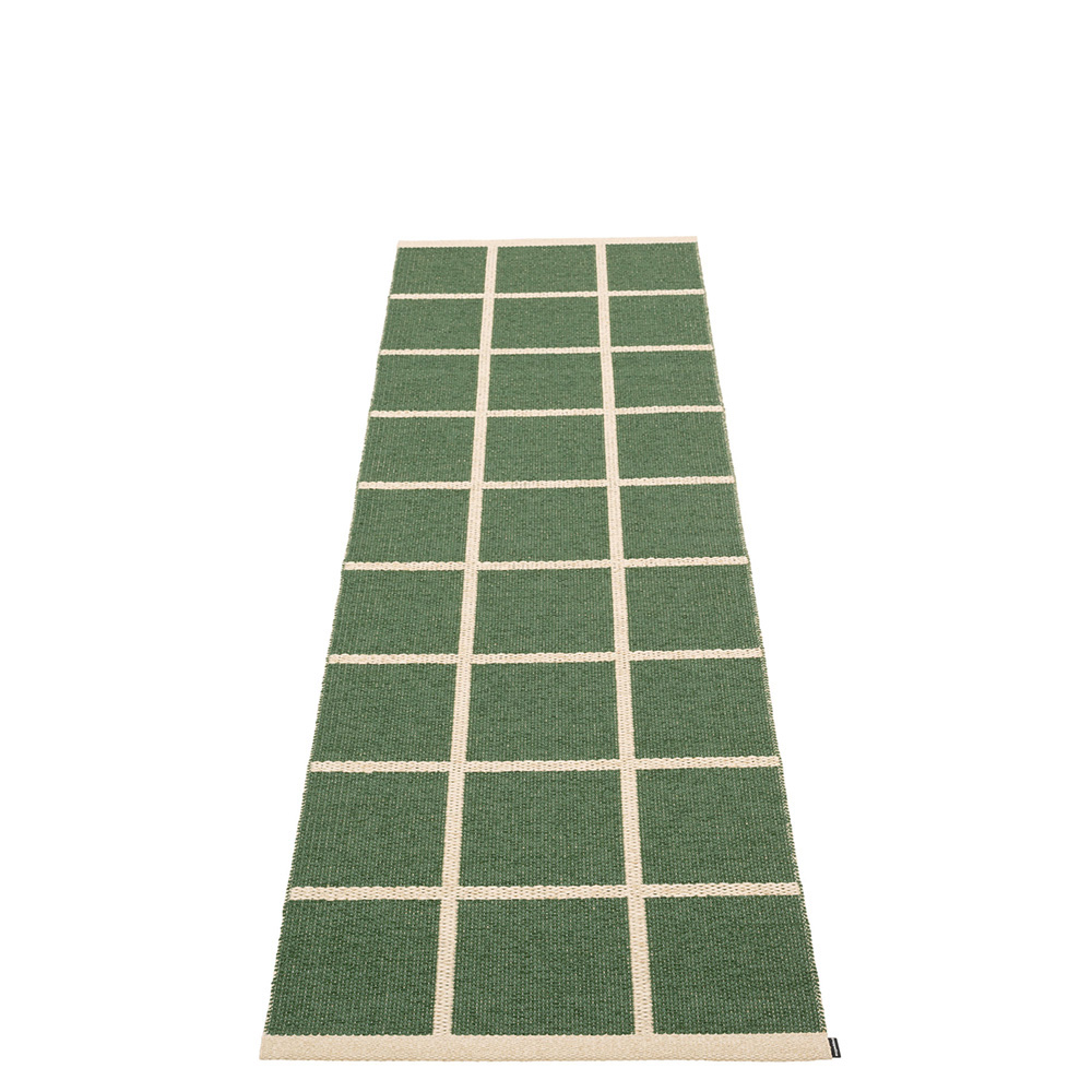 Smuk tæppeløber i giftfri plast, vævet af de bedste på markedet: Pappelina. Tæppet kan vaskes i vaskemaskine, og er meget holdbart og robust, samtidig med at det ligger helt plant på gulvet. Ikke noget med at man skrider rundt i det, som man f.eks. gør med løbere i bomuld.