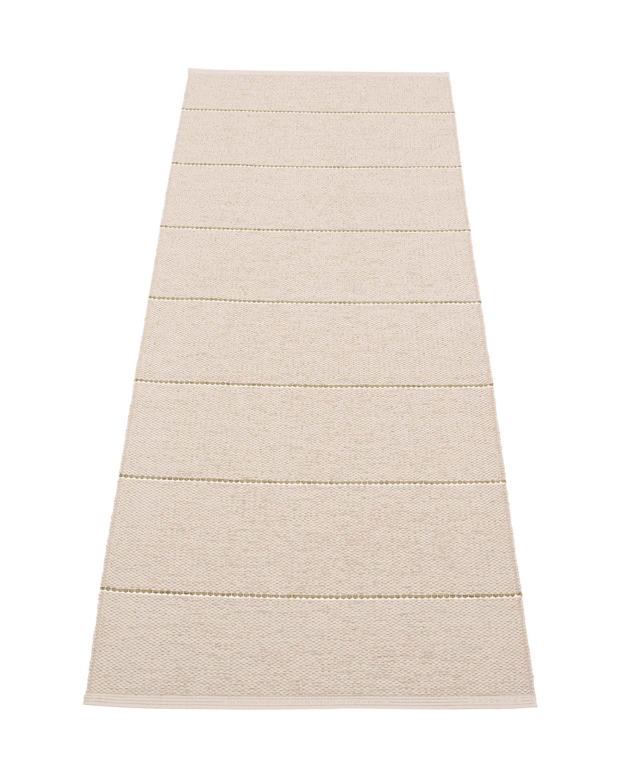 Pappelinas tæpper fås enten med en svejset, flad kant i de 2 korte ender, eller de fås med en vævet, lidt tykkere afslutning. Dette tæppe har altid svejsede kanter. Der er ikke noget, der er bedre end andet, det er blot en forskel. De svejsede kanter er lavere end selve tæppet, og dermed gode, hvis de skal kunne ligge under f.eks. en indgangsdør. De vævede er der nogen, der synes, giver et flottere og mere tæppe-agtigt look. Her hos moods har vi ikke nogen præference for det ene eller det andet. Vælg dit Pappelina ud fra størrelse og farver og design. Det er vores råd.