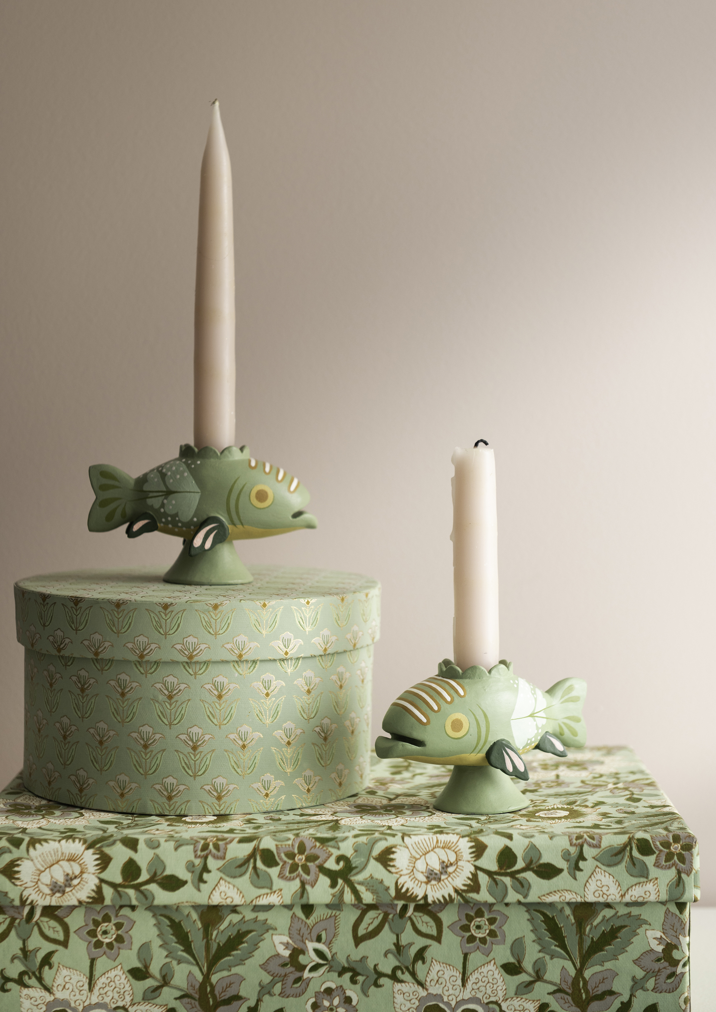 Charmerende lysestage formgivet som fisk og smukt håndmalet i det fineste folklore mønster.