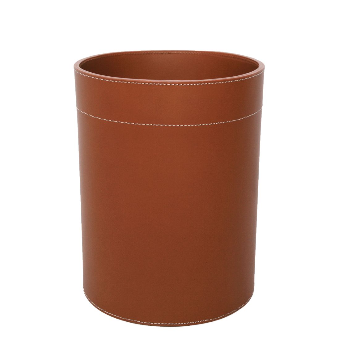 Flot og elegant udformet papirkurv, håndsyet i kraftig cognacfarvet læder med hvide syninger. Læderet er recyckled, hvilket er noget, vi er ekstra glade for her hos moods.dk.