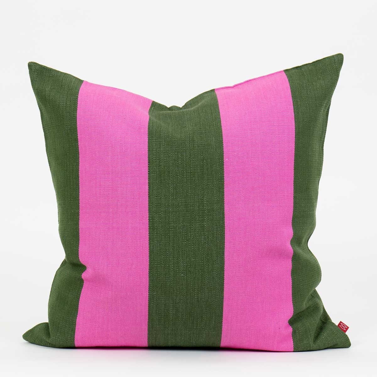 Fantastisk smuk stribet pudebetræk i klare farver. Pudebetrækket er fairtrade produceret og vævet i en kraftig bomuld efter gamle teknikker og traditioner fra Mayafolket i Guatemalas højland.