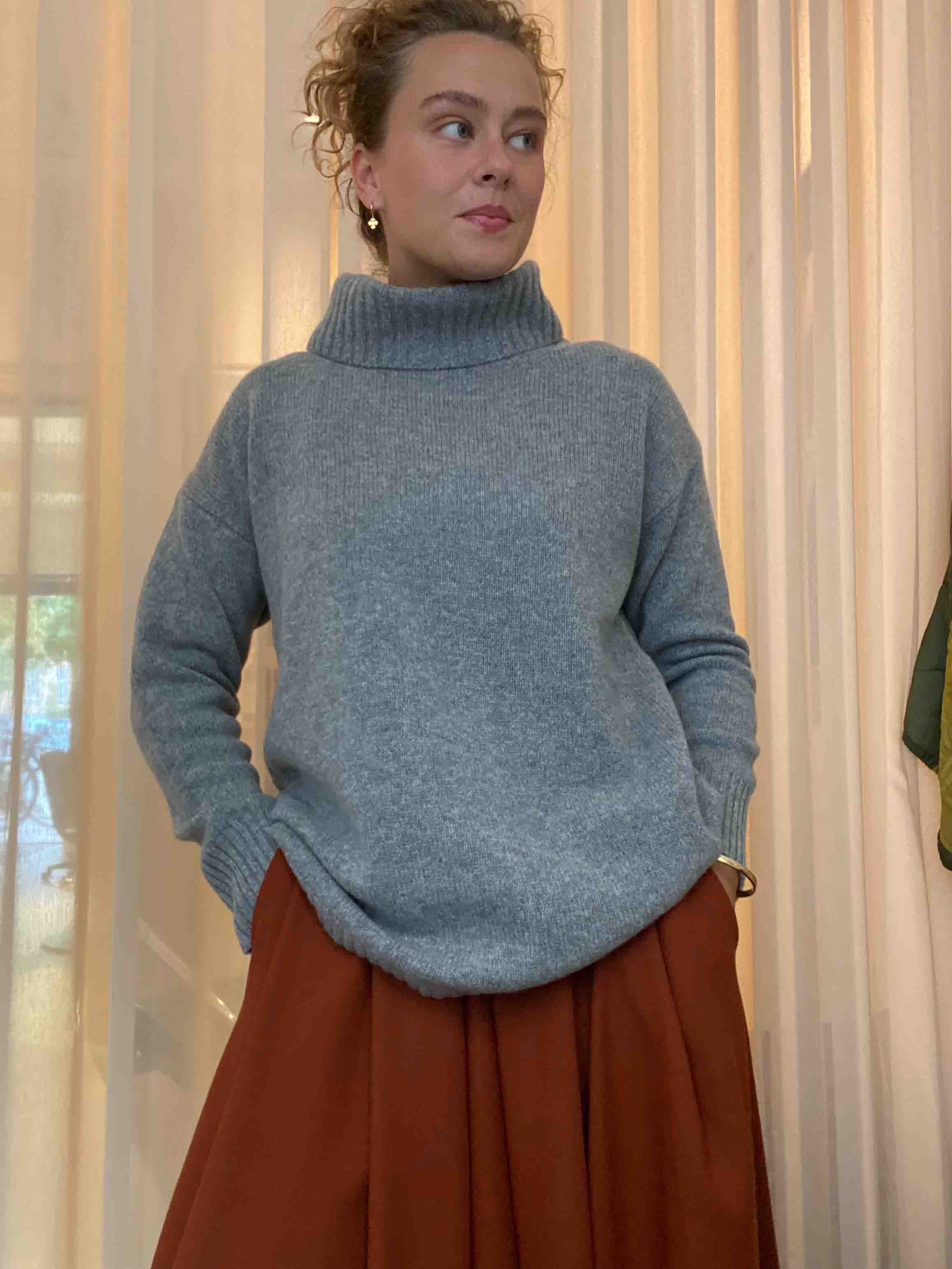 Rullekraven er ikke for stram, men helt tilpas, så den ser flot ud og samtidig også giver varme om halsen. Modelllen har en ribkant forneden, men den er ikke stram. Tværtimod lige tilpas og med en utrolig klædelig afrunding både for og bag.