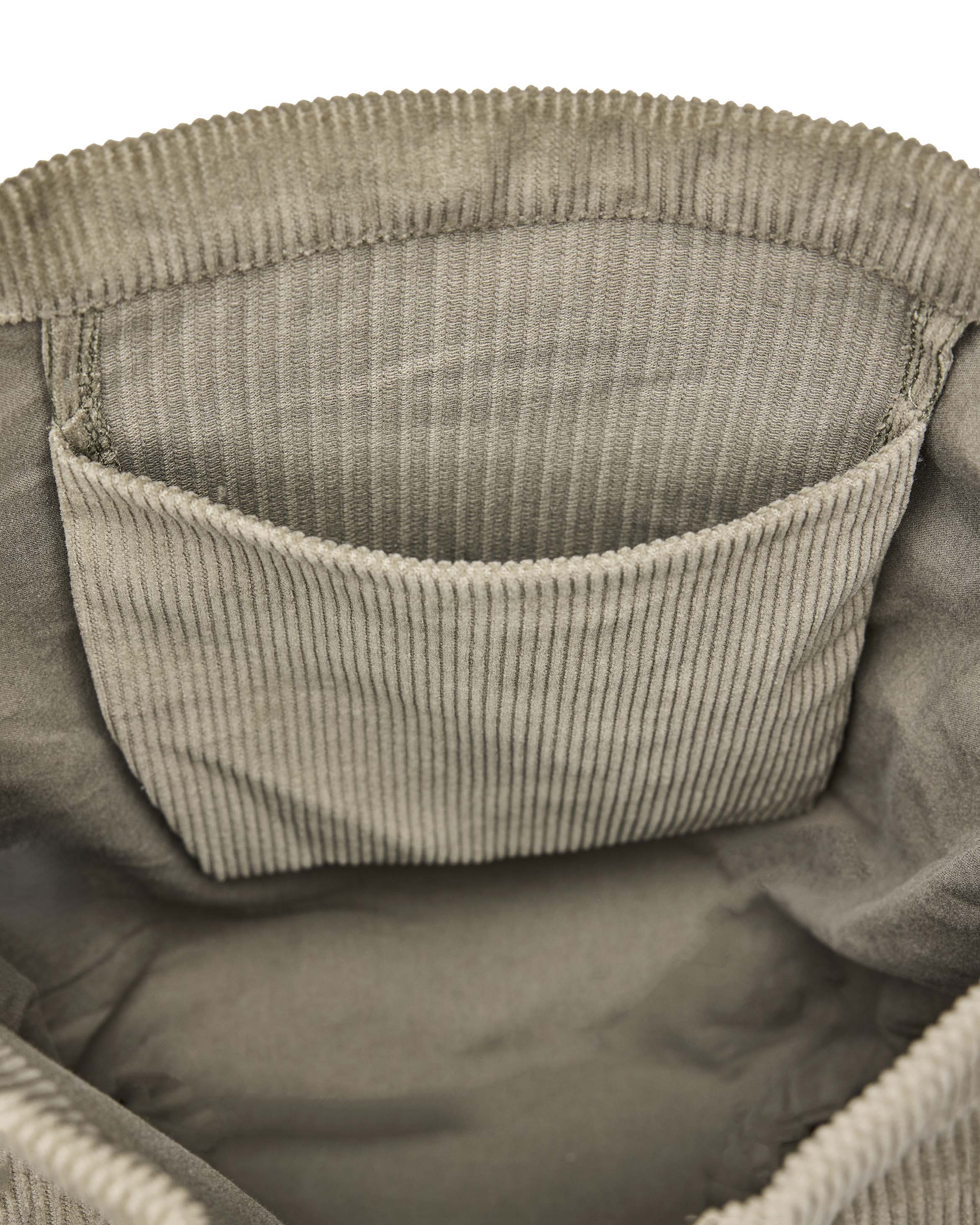 Mati tasken er lavet i riflet fløjl, og har flere lommer: 1 udvendig lomme som eks. vis kan bruges til drikkedunk, og 1 indvendig lomme til eks. småting som mobil, nøgler og pung.