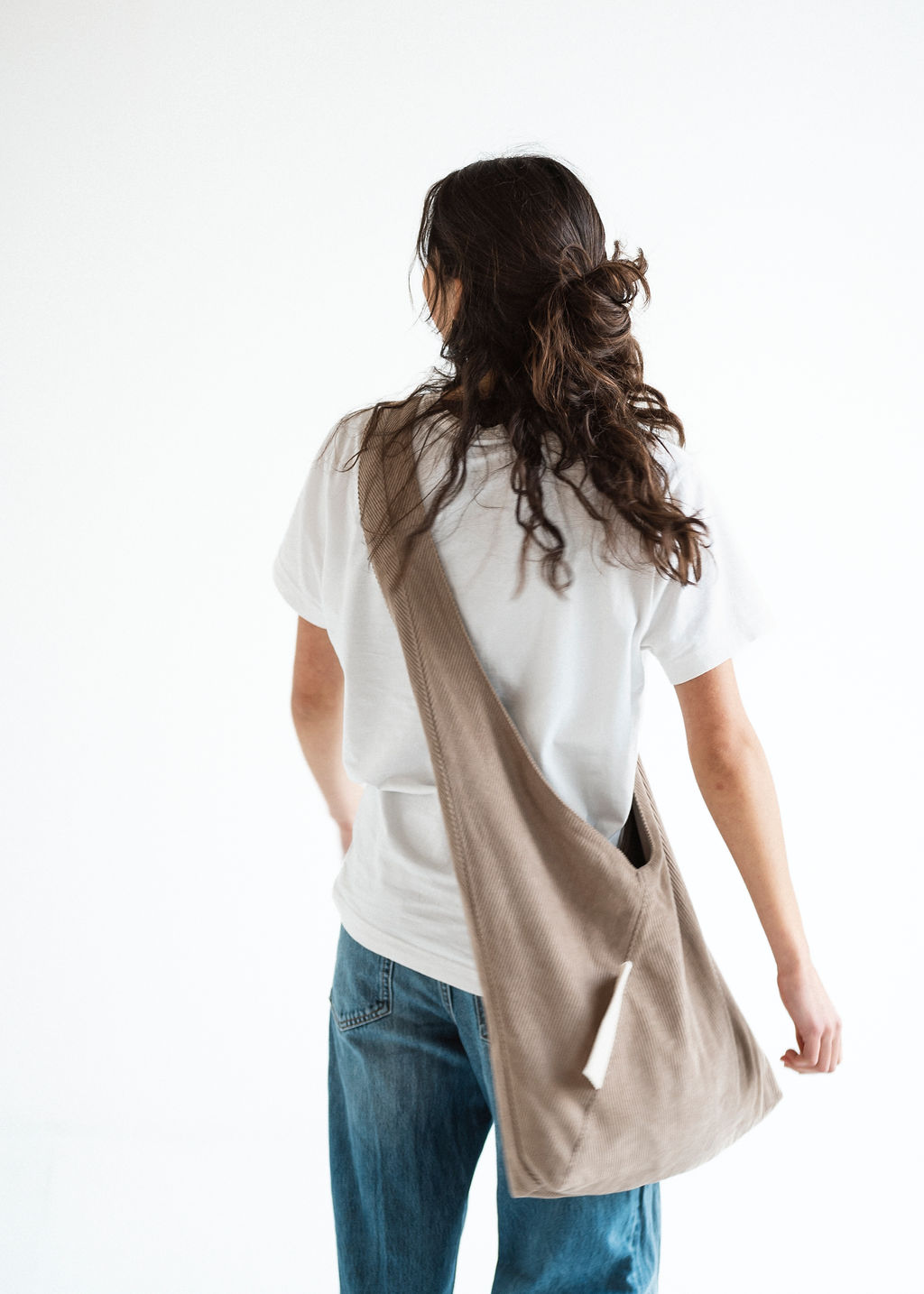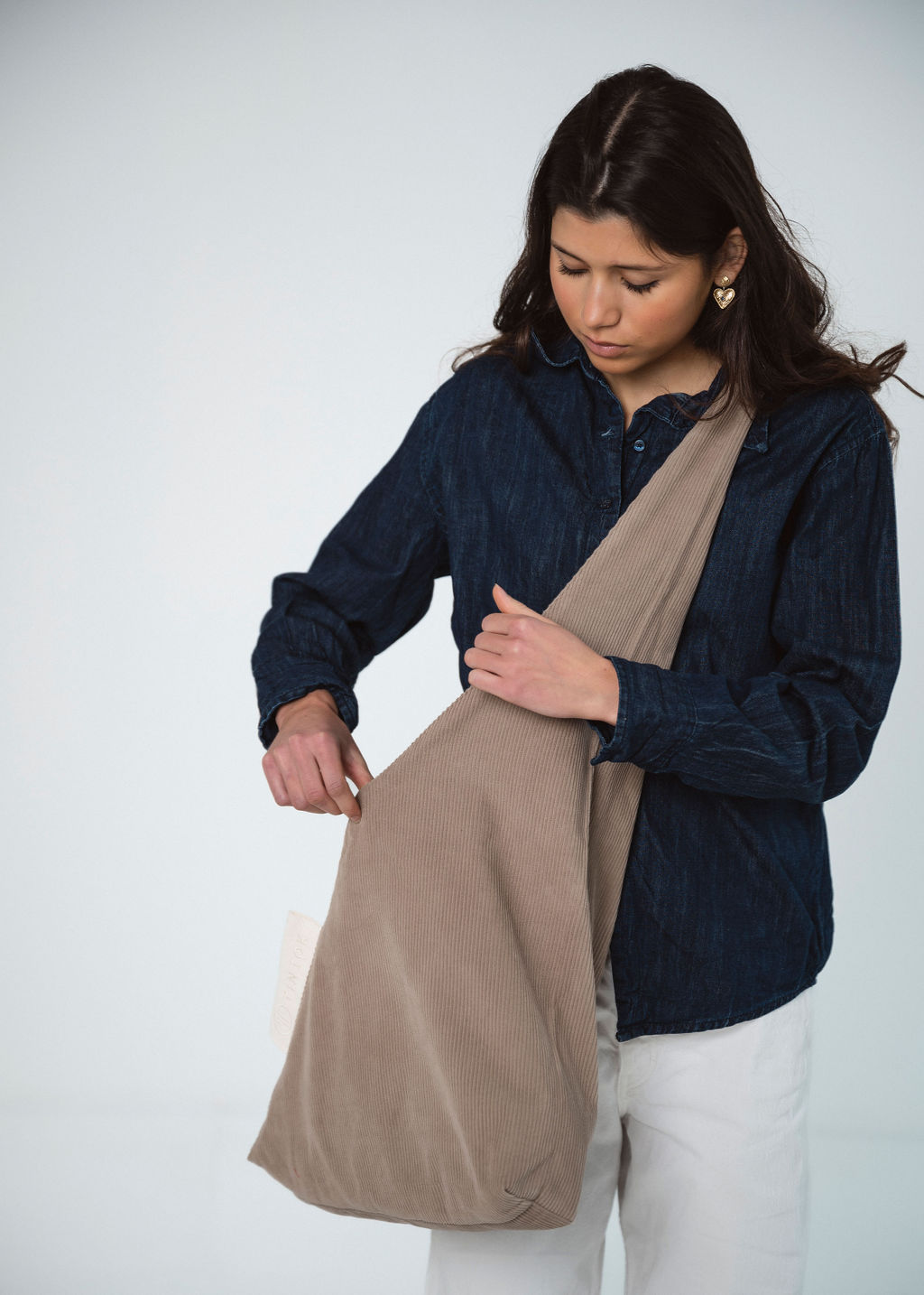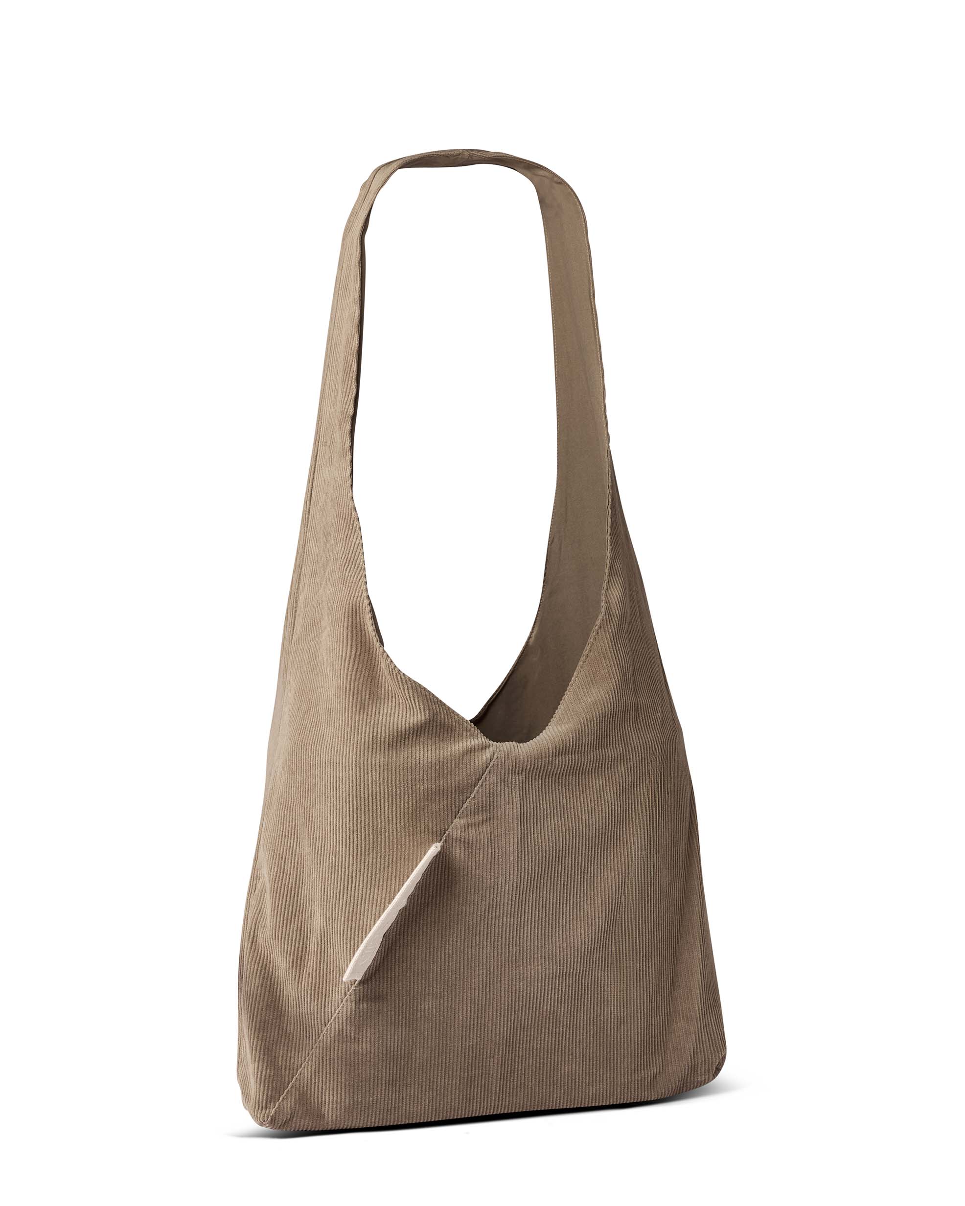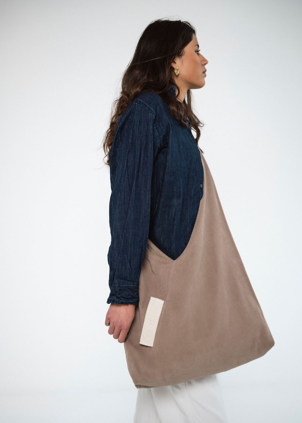 Tasken er unisex og stor og rummelig. Genial til indkøb, weekendtur, sportstøj osv. Den er lavet i riflet fløjl, og har en indvendig lomme samt er foret.